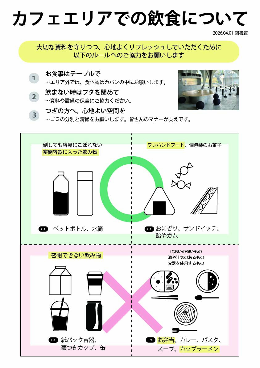 八王子図書館では、より快適に施設をご利用いただくため、オープンスペース内「カフェエリア」での軽食を可能とします。